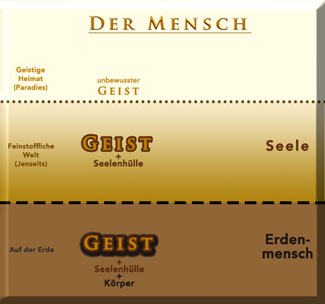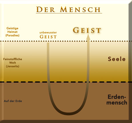 Der Kern und Ursprung des Menschen ist der ewige, aber zunächst noch unbewusste Geist. Er verließ mit dem Drang zur Entwicklung die geistige Heimat, das Paradies, und gelangte zunächst in die feinstoffliche Welt, oder auch Jenseits genannt. Um dort leben zu können, bedurfte er einer der Ebene angepassten Seelenhülle. Damit umgeben wird der Geist als Seele bezeichnet. Das ist vergleichbar mit einem Menschen, der zum Tauchen in großer Tiefe einen speziellen Taucheranzug benötigt. Eine Seele hat also kein eigenständiges Bewusstsein, sondern ist ein der feinstofflichen Umgebung angepasster, umhüllter Geist.